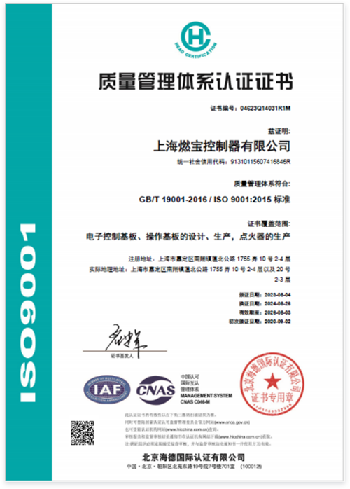 电子控制基板、操作基板的设计、生产,点火器的生产,获得ISO9001质量管理体系认证证书。